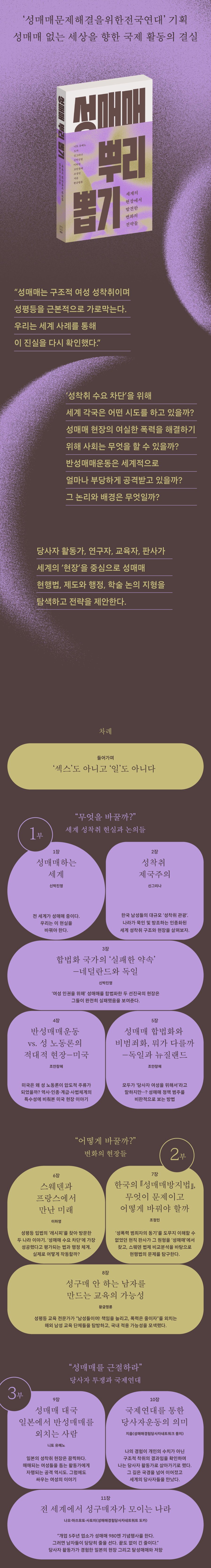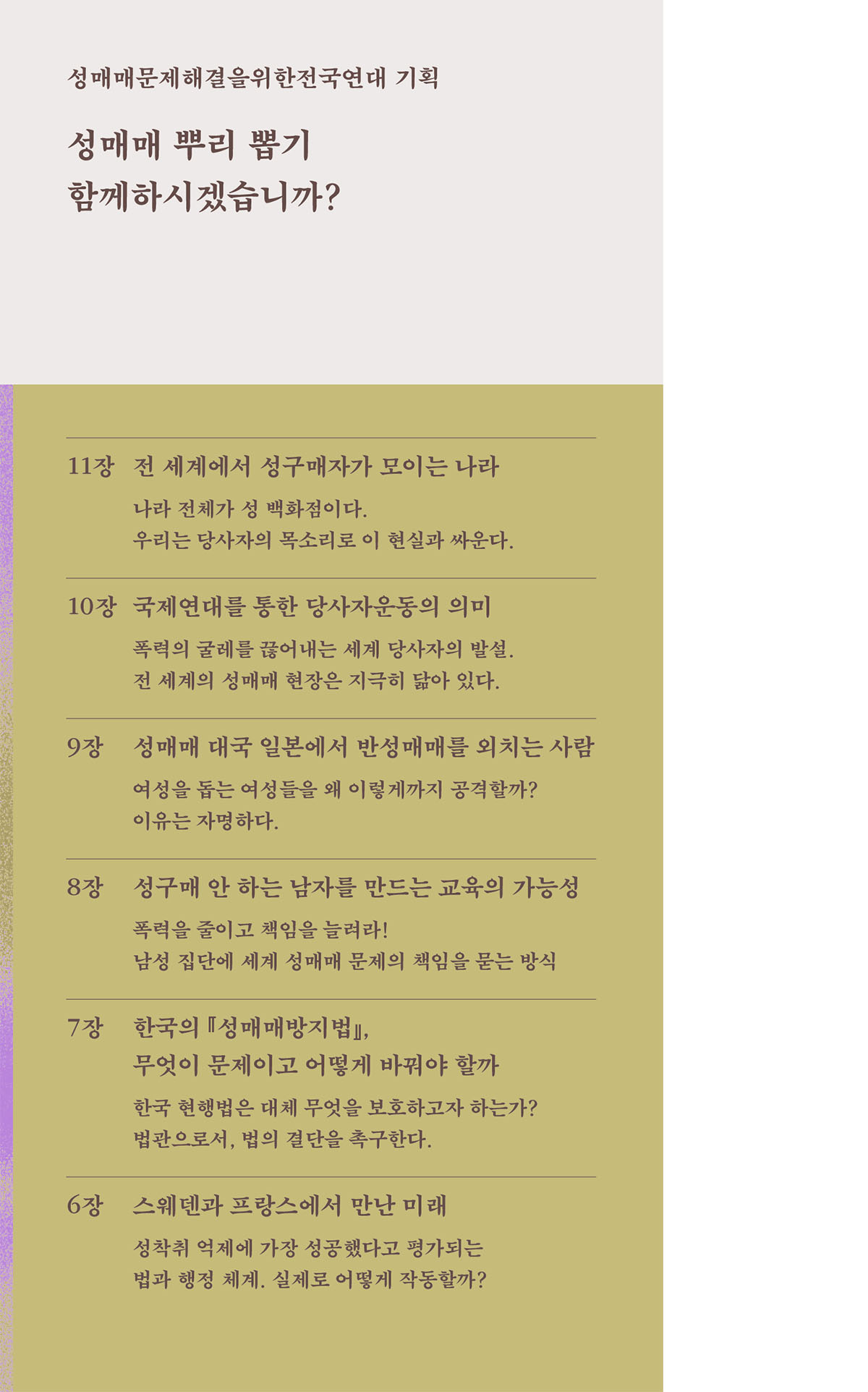 이 책의 저자로 참여한 당사자 활동가, 연구자, 교육자, 판사, 연대자들은 각자의 자리에서 여기에 답하고 있다. 여성 폭력을 양산하는 세계의 ‘현장’을 중심으로 각국의 현행법, 행정 실태, 논의 지형, 국제연대 활동을 소개하고 변화의 전략을 제안한다. 전문가들이 풀어낸 고민과 답, 실천과 미래를 읽고 ‘성매매 뿌리 뽑기’에 함께할 독자들을 기다린다.