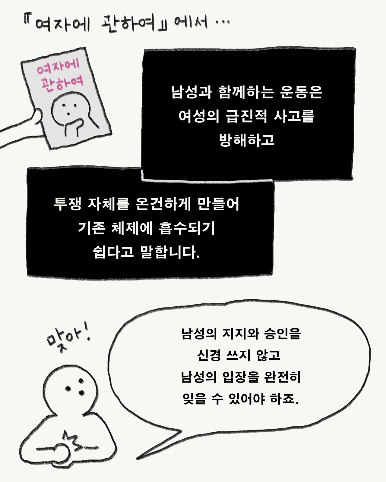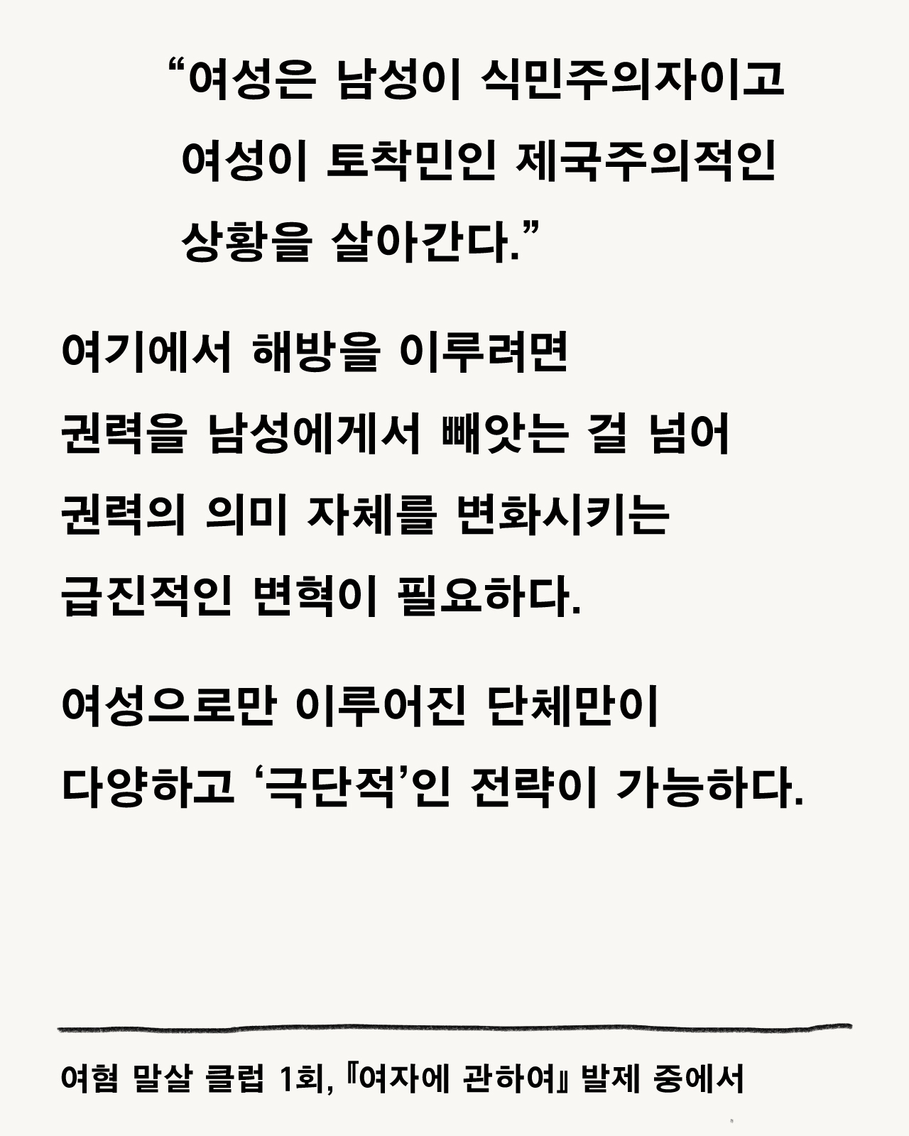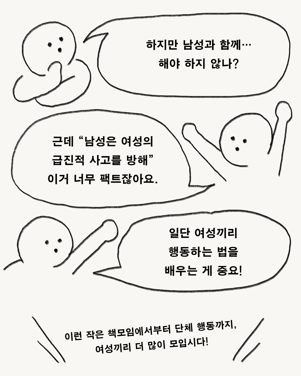 모임에서는 여성 조직화가 정치적으로 필요한 동시에, 페미니스트 자아를 지키며 살아가는 데 여성 커뮤니티가 큰 도움이 되더라는 경험들도 오갔지요.